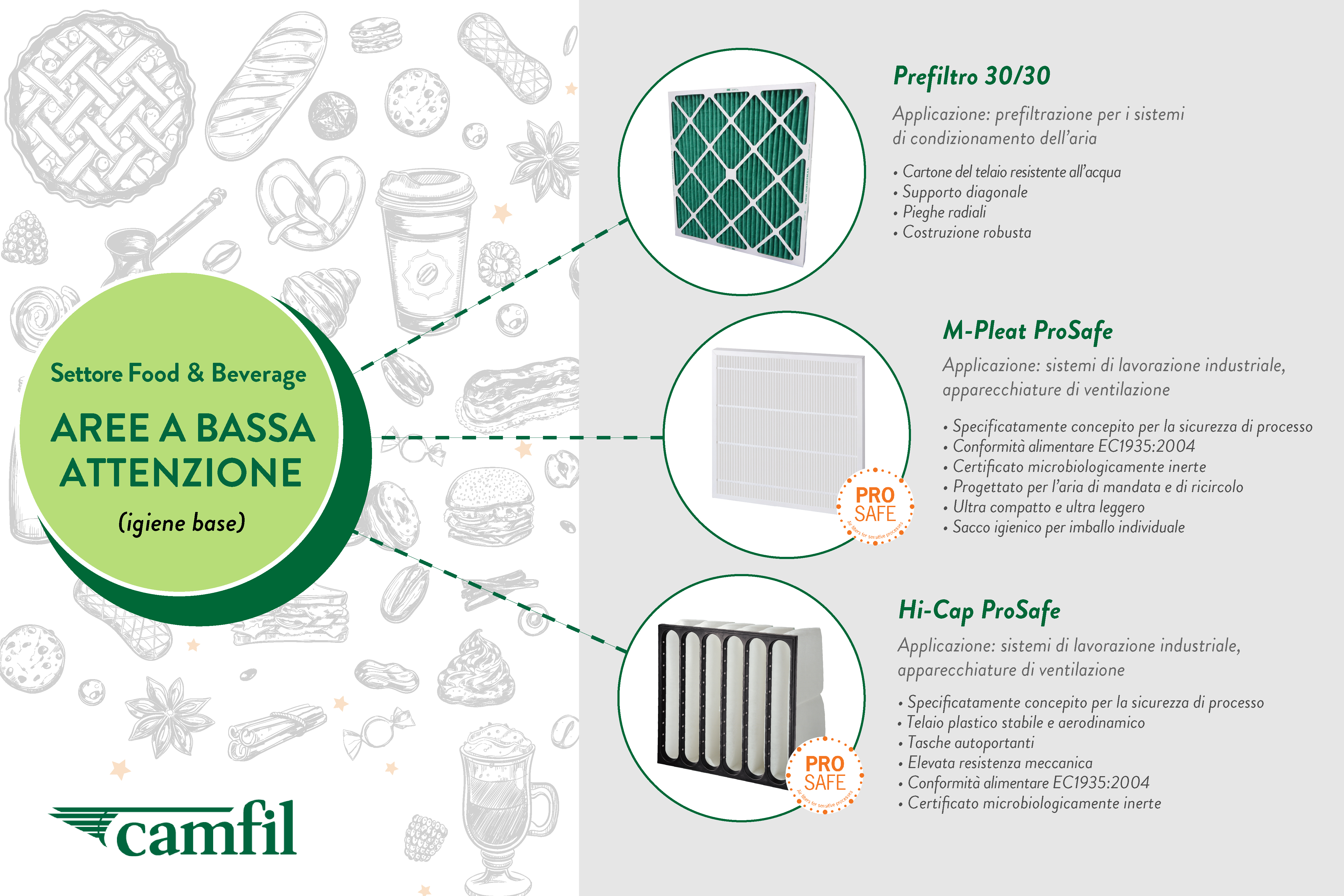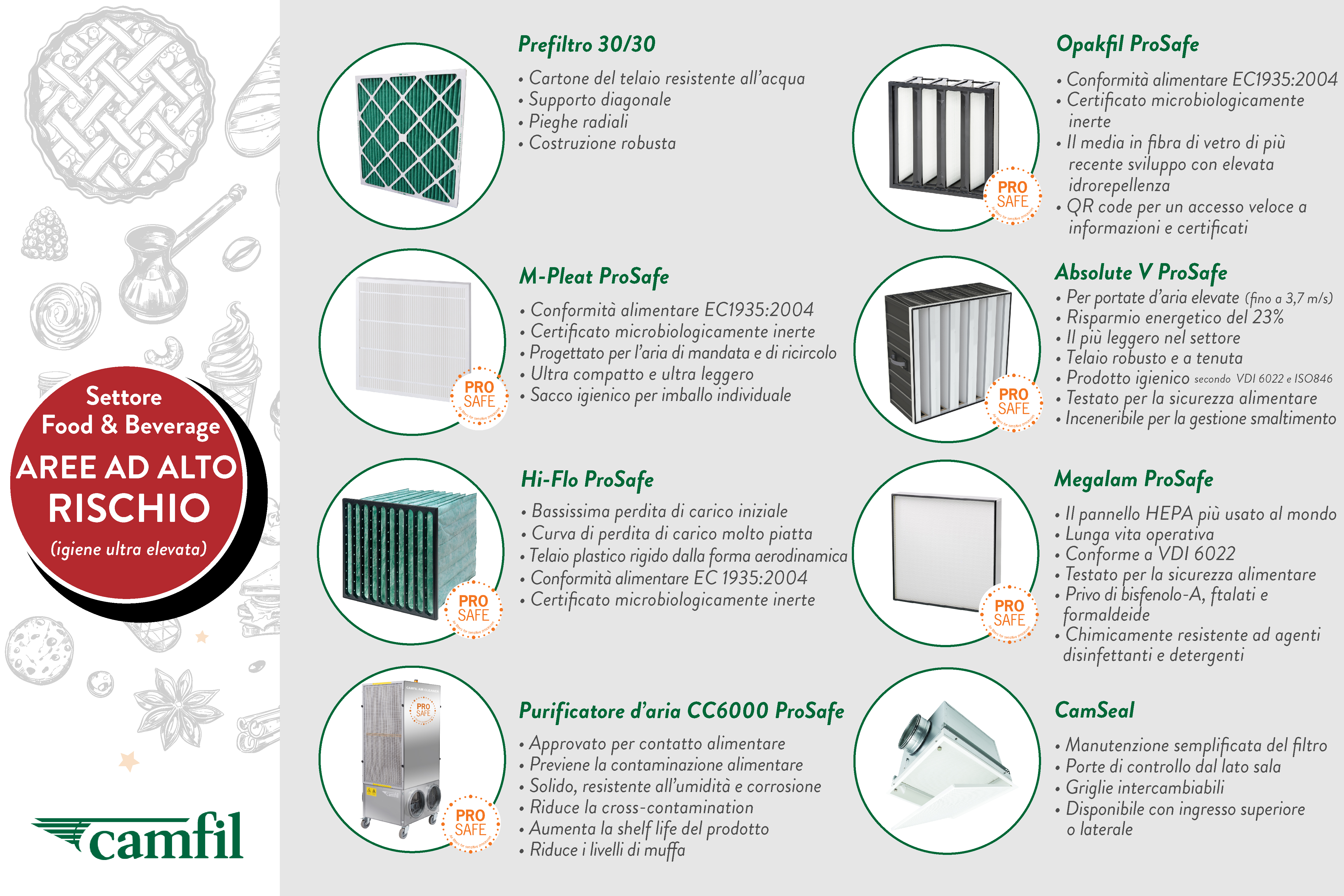 Offriamo all'industria Food & Beverage una gamma completa di filtri ProSafe – specificatamente progettati per un utilizzo nei processi con requisiti stringenti in materia di sicurezza, tracciabilità e controllo.
