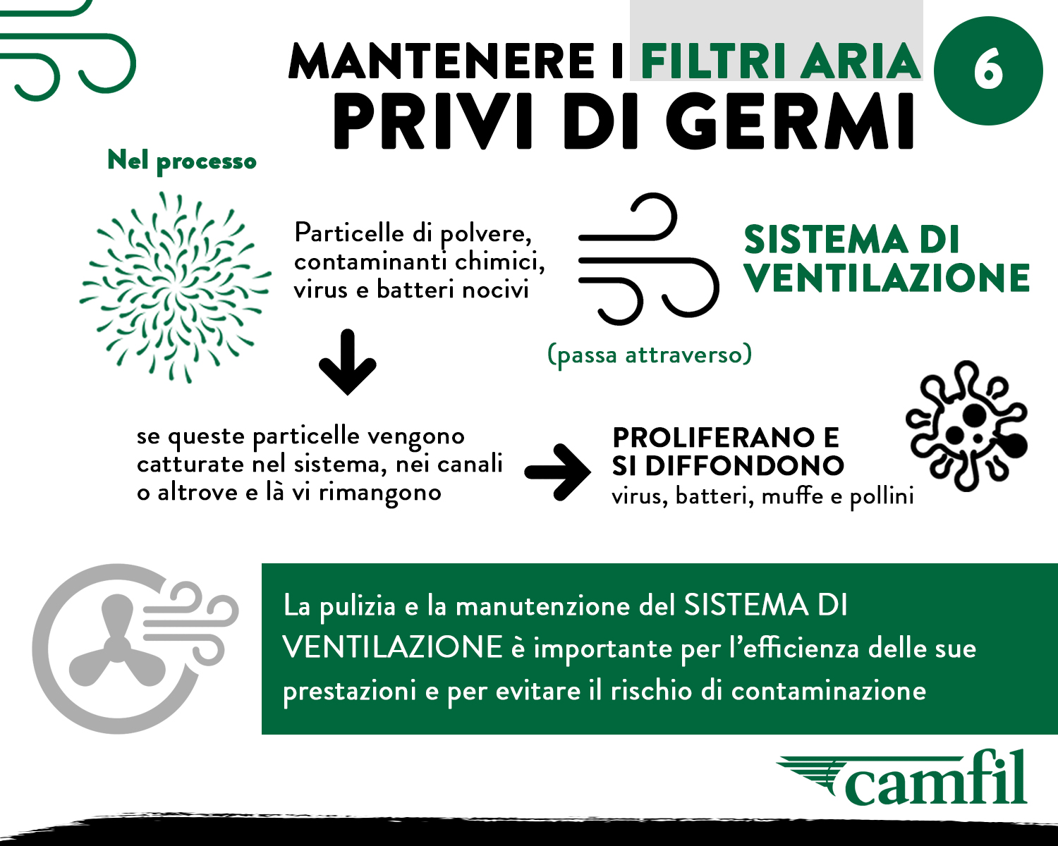 Nelle unità HVAC, il sistema di ventilazione estrae particelle di polvere, contaminanti chimici e virus e batteri nocivi, oltre ad altre particelle tossiche. Ma questi devono andare da qualche parte. Alcuni di questi contaminanti vengono catturati dai filtri o nei canali o altrove, e lì rimangono. Questo non va bene e può causare seri rischi di salute. Per evitare qualunque intasamento, la pulizia e la manutenzione del sistema di ventilazione sono necessari. Un sistema pulito in buone condizioni igieniche e operative può aiutare a rimuovere le particelle tossiche dall'aria. In caso di epidemia il primo passo dovrebbe essere quello di verificare se i filtri sono vecchi e se hanno catturato parecchio sporco (materiale organico che può favorire la crescita di muffa). Si raccomanda di sostituirli immediatamente con filtri nuovi e puliti e, al tempo stesso cercare di effettuare un upgrade della classe di filtrazione. Un'altra buona procedura è quella di verificare lo stato delle guarnizioni e di altri sigillanti per garantire che qualunque by-pass di aria venga eliminato. A seconda del tipo di unità e delle sue funzionalità questo può essere eseguito da professionisti in diversi modi. Le unità più critiche o per applicazioni ad alto rischio utilizzano la tecnica bag in-bag out che viene eseguita da un esperto poiché nessun contatto con il filtro deve verificarsi in modo da contenere i patogeni e le particelle nocive.