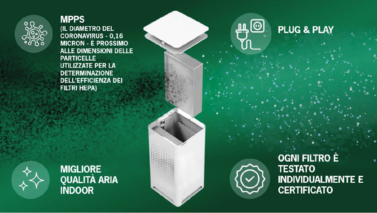 Per questi motivi la filtrazione del particolato con sistemi di ricircolo plug and play dotati di filtri HEPA può essere considerata un efficace e semplice sistema di riduzione del rischio microbiologico causa di airborne infection negli studi dentistici: i virus infatti vengono trattenuti dai filtri HEPA nella misura del 99,95%, e in misura ancora maggiore qualora siano adesi a particelle più grandi, per le quali il filtro HEPA ha un‘efficienza di filtrazione addirittura superiore.