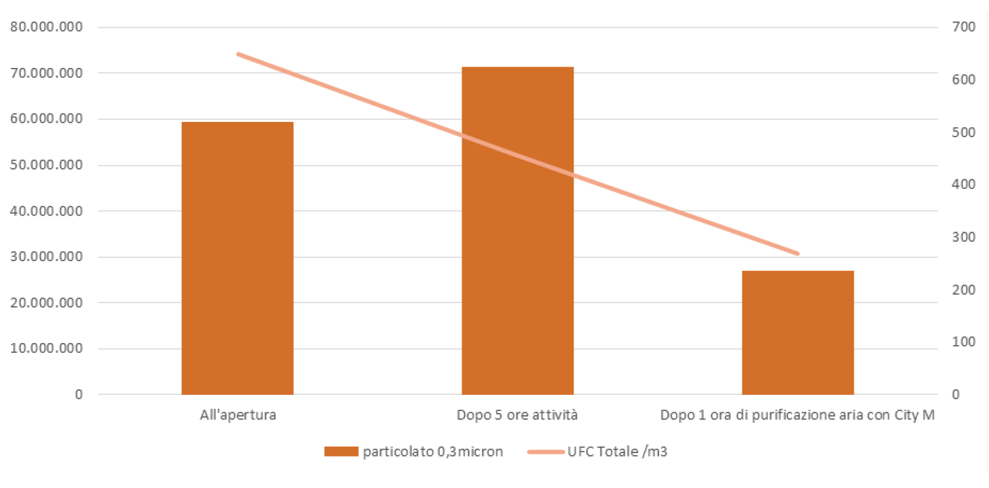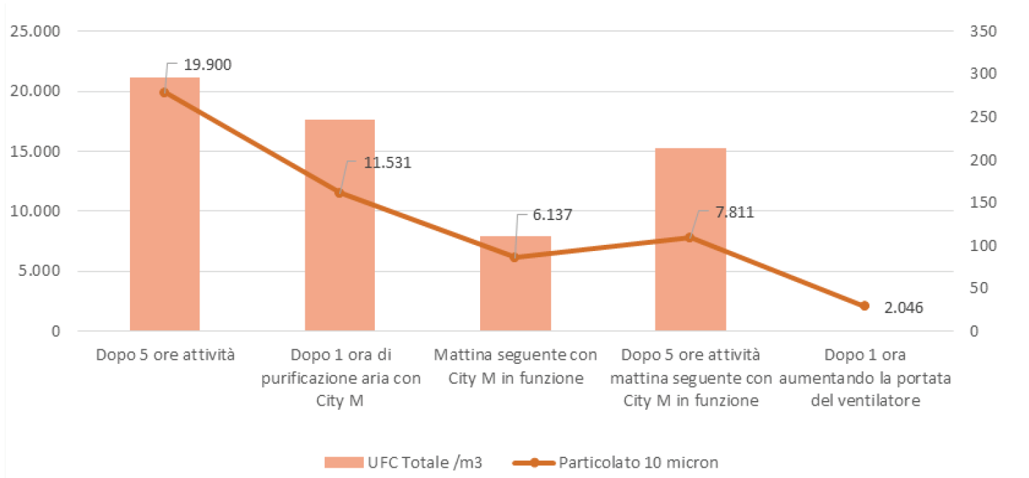 Per comprendere al meglio l’impatto delle sorgenti umane di contaminazione interna si è preso in considerazione la frazione di particolato avente diametro pari a 10 micron, ossia la frazione in cui maggiormente si collocano le particelle provenienti da attività umane. Inoltre, essendo queste particelle aggregatori di particolato e batteri di diametro inferiore, questa frazione si rivela un parametro chiave di riferimento per l’effetto di purificazione ambientale ottenuto con il City M.