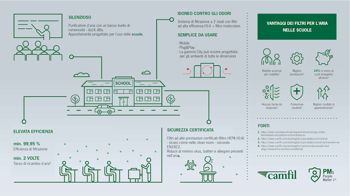 Un tasso di ricambio d’aria sufficiente è importante per garantire ciò. Il tasso di ricambio d’aria non significa un ricambio completo dell’aria, ma la proporzione di aria fresca o purificata fornita all'ora in base al volume della stanza. Per aumentare la sicurezza di studenti e insegnanti e per ridurre il rischio di diffusione del virus, Camfil ha sviluppato i purificatori d'aria autonomi e robusti della serie City. La filtrazione HEPA (H13) con un'efficienza di filtrazione testata del 99,95% e il tasso di ricambio d'aria consentono di intrappolare nel filtro le impurità presenti nell'aria indoor, proteggendo quindi dall'infezione da SARS-CoV-2. Scopri quali miglioramenti si possono apportare alla qualità dell'aria nella classe dei tuoi figli.