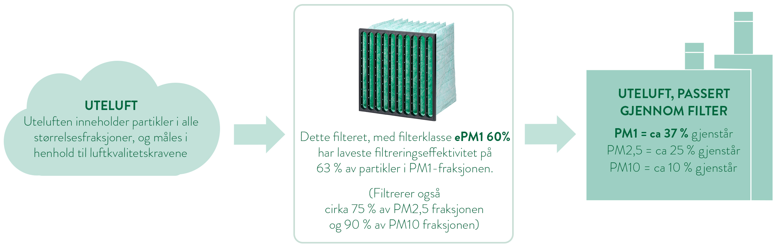PM1 er den viktigste og mest relevante partikkelfraksjonen i filtreringsprosessen for å skape et sunt og godt innemiljø der mennesker og prosesser er optimalt beskyttet. Det er de minste partiklene som er de farligste for oss mennesker fordi menneskekroppen ikke har tilstrekkelig beskyttelse mot disse ekstremt små partiklene. De kommer inn i kroppen vår gjennom luftveiene, vi inhalerer dem, og de havner dypt i lungene og fortsetter inn i blodet. Studier utført av Lars Ekberg ved CIT (Chalmers Industriteknik) viser at det kreves et luftfilter med minst PM1 60% for å filtrere ut farlige partikler fra uteluften. Se rapporten: Betydningen av ventilasjonsfilter for partikkelkonsentrasjonen i inneluften. Se også våre informasjonsbrosjyrer PM1: små partikler - en helserisiko og PM1 - Betydningen av god inneluft.