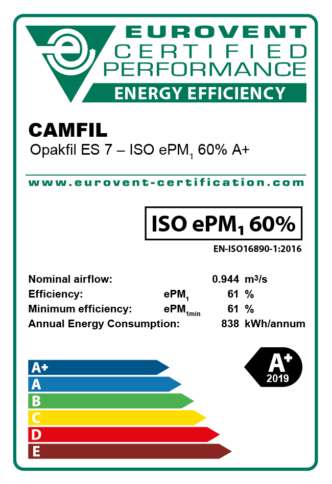 Luftfilter for generelle ventilasjonssystemer blir uavhengig testet og vurdert i henhold til Eurovent 4/21-testprotokollen. I disse testene blir versjonen i full størrelse (595x595 mm) testet i løpet av dets levetid, og deretter beregnes energiforbruket. Alle filter som er testet skal vise Eurovent Energy Efficiency-etiketten på boksen til filteret. Bildet til høyre viser et eksempel på en Eurovent-etikett for vår Opakfil ES. I denne etiketten skal du kunne se:
