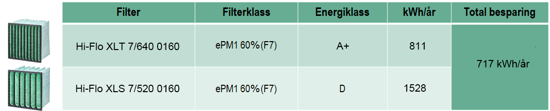 Et filter er enkelt å bytte ut. Ved å velge riktig filter kan du oppnå store energibesparelser og samtidig opprettholde en høy kvalitet på inneluften, uten at det går ut over helsen til de som holder til i rommet. Å kjøre luft gjennom filteret kan utgjøre så mye som 30% av det totale energiforbruket i en enhet, og det er viktig å vite at et filter med lav kjøpesum kan bety høytere energiforbruk. Lavt energiforbruk bør aldri prioriteres fremfor effektiv filtrering.