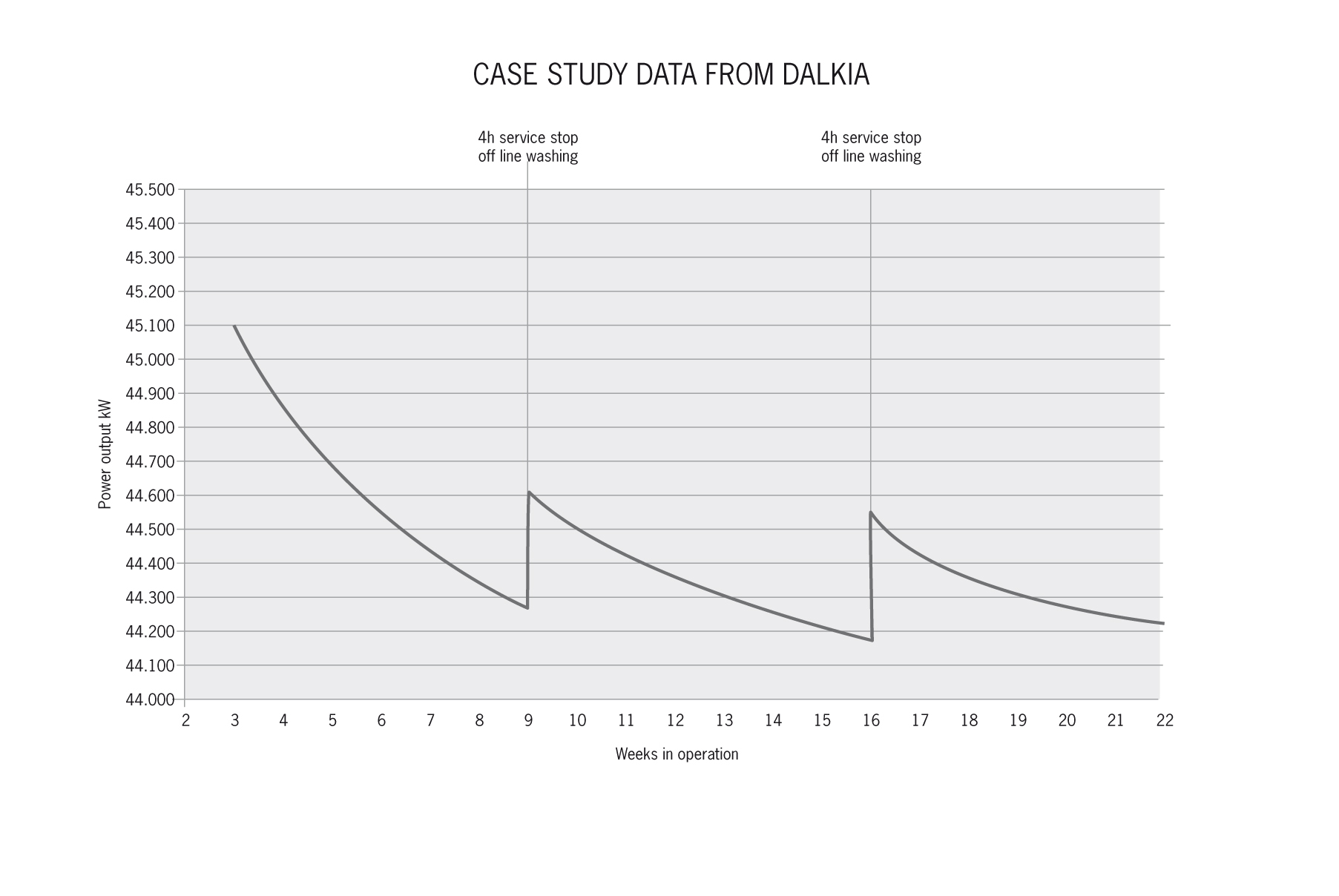 The primary objective of Dalkia’s tests was to keep the compressor as clean as possible during the entire operating season, without the need for shutdowns for washing. An off-line wash represents about 6-7 hours of production losses. Each hour means a loss of 45 MW from the time the engine’s running speed is reduced to the cleaning of the compressor and until the engine is started again.