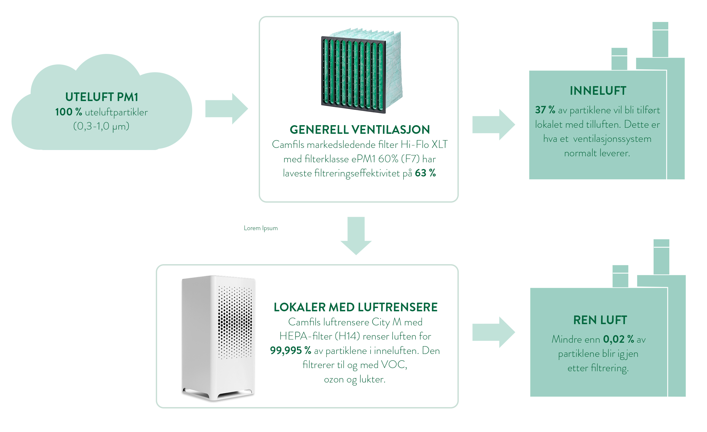Heldigvis kan vi påvirke inneluften med enkle grep. I første omgang er det viktig å sørge for at boligens ventilasjonsløsning er funksjonell og i god stand. Dette gjøres ved å kontrollere at anlegget vedlikeholdes regelmessig, at filtrene har riktig filterklasse og at de skiftes ut med riktig intervall. Husk at ventilasjonsfilter er det eneste som beskytter oss mot forurensninger. Camfil anbefaler en filterklasse på minst ePM1 60 % som tilluftsfilter. Mange av våre kunder i urbane miljøer har også begynt å bruke våre kombinationsfiltre med kull for å redusere avgasser og andre molekylære forurensninger som lukt. Få hjelp av ditt lokale ventilasjonsfirma til å gjennomgå hele ventilasjonssystemet og få forslag til forbedringer.