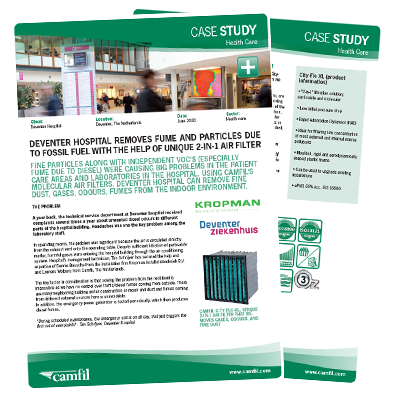 DROBNY PYŁ W POŁĄCZENIU Z LOTNYMI ZWIĄZKAMI ORGANICZNYMI (W SZCZEGÓLNOŚCI SPALINAMI Z SILNIKÓW DIESLA) POWODOWAŁ POWAŻNE PROBLEMY W OBSZARACH SZPITALNYCH GDZIE PRZEBYWAJĄ PACJENCI, ALE RÓWNIEŻ W LABORATORIACH W KTÓRYCH NA CODZIEŃ PRACUJE PERSONEL SZPITALA. DZIĘKI ZASTOSOWANIU FILTRACJI MOLEKULARNEJ FIRMY CAMFIL, W SZPITALU DEVENTER ZACZĘTO USUWAĆ DROBNE PYŁY, GAZY, ZAPACHY I OPARY Z POMIESZCZEŃ ZAMKNIĘTYCH.