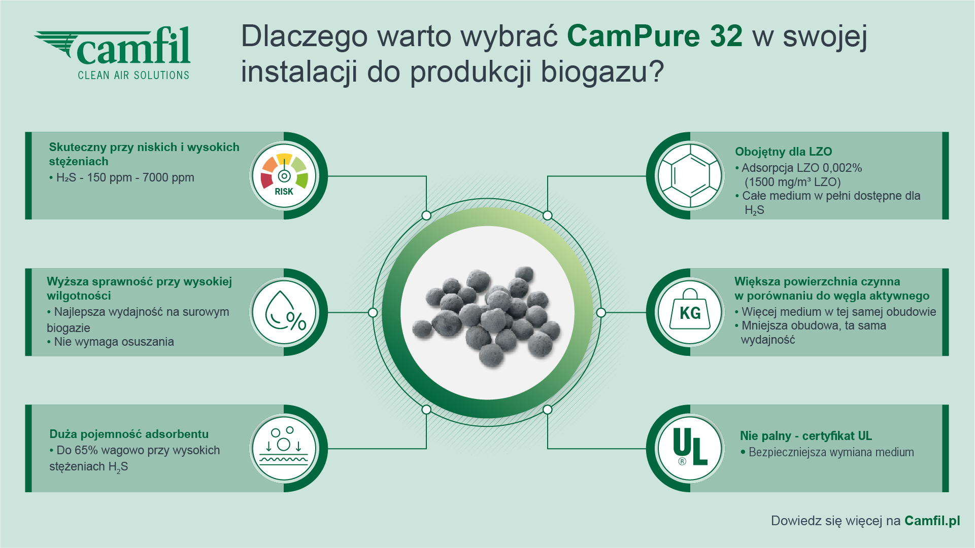 Campure 32 to nowoczesne i sprawdzone medium do usuwania siarkowodoru przy produkcji biogazu w procesie beztlenowej fermentacji. Ten wysokiej jakości materiał filtracyjny jest kombinacją adsorbentów, poddanych impregnacji chemicznej. Medium to ma niższą zawartość pyłu w porównaniu z klasycznym węglem, a także wykazuje dłuższą żywotność. CamPure 32 jest certyfikowany zgodnie z normą UL 900. Niskie właściwości palne czynią go znacznie bezpieczniejszym medium niż węgiel. Jest to ważna cecha w przypadku zastosowania w środowisku, w którym zapłon złoża adsorbentu stanowi realne zagrożeni np. przy produkcji biogazu.