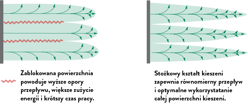 Stożkowy kształt kieszeni, zapobiega blokowaniu powierzchni filtracyjnej, zwiększa przepływ powietrza, a tym samym zmniejsza zużycie energii. Odbywa się to bez uszczerbku dla wydajności filtra (stopnia separacji).