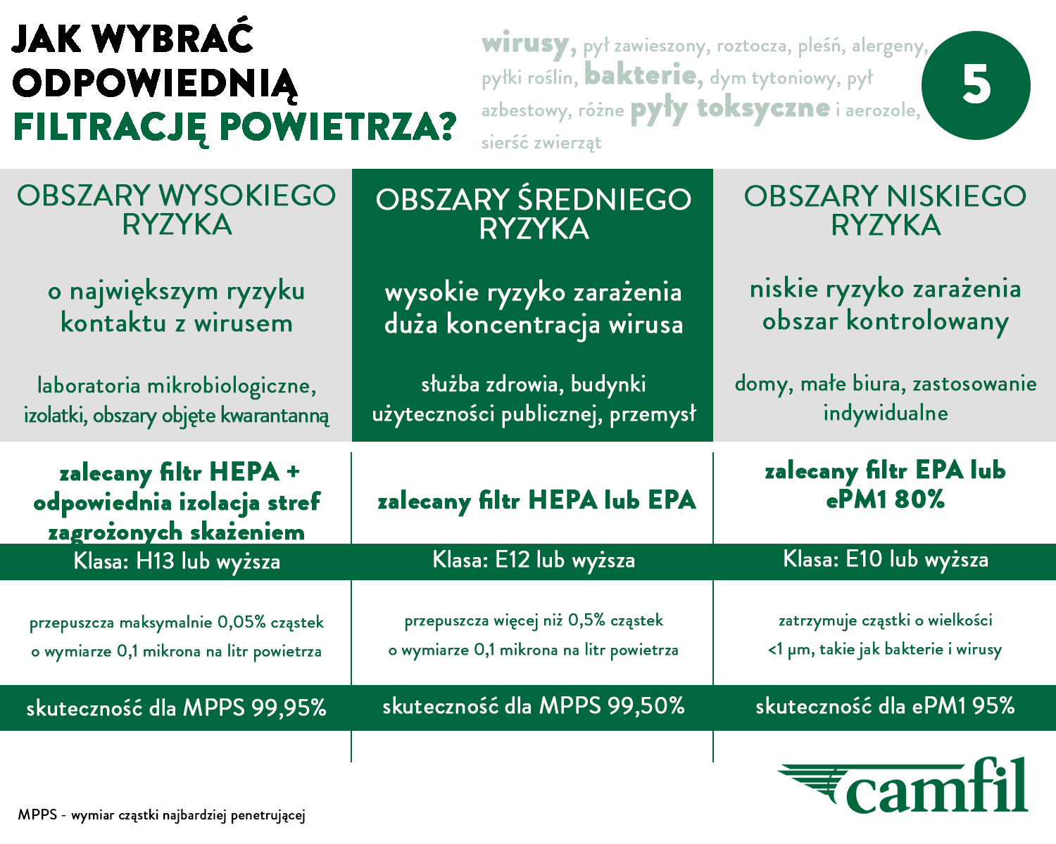 Skuteczność filtrów HEPA mierzona jest dla cząstki MPPS (wymiar cząstki najbardziej penetrujący), co oznacza, że dla tego wymiaru filtr będzie miał najmniejszą skuteczność. W przypadku mniejszych lub większych cząstek, filtr ten będzie miał znacznie wyższą skuteczność. Cząstka MPPS ma zazwyczaj rozmiary od 0,1 do 0,2 mikrometra. Bakterie i wirusy są często mniejsze, ale zazwyczaj przyczepiają się do większych cząsteczek. Ważne jest również, aby zrozumieć, że filtry HEPA nie zabijają żywych organizmów. Zatrzymują je i nie pozwalają wydostać poza medium filtracyjne.