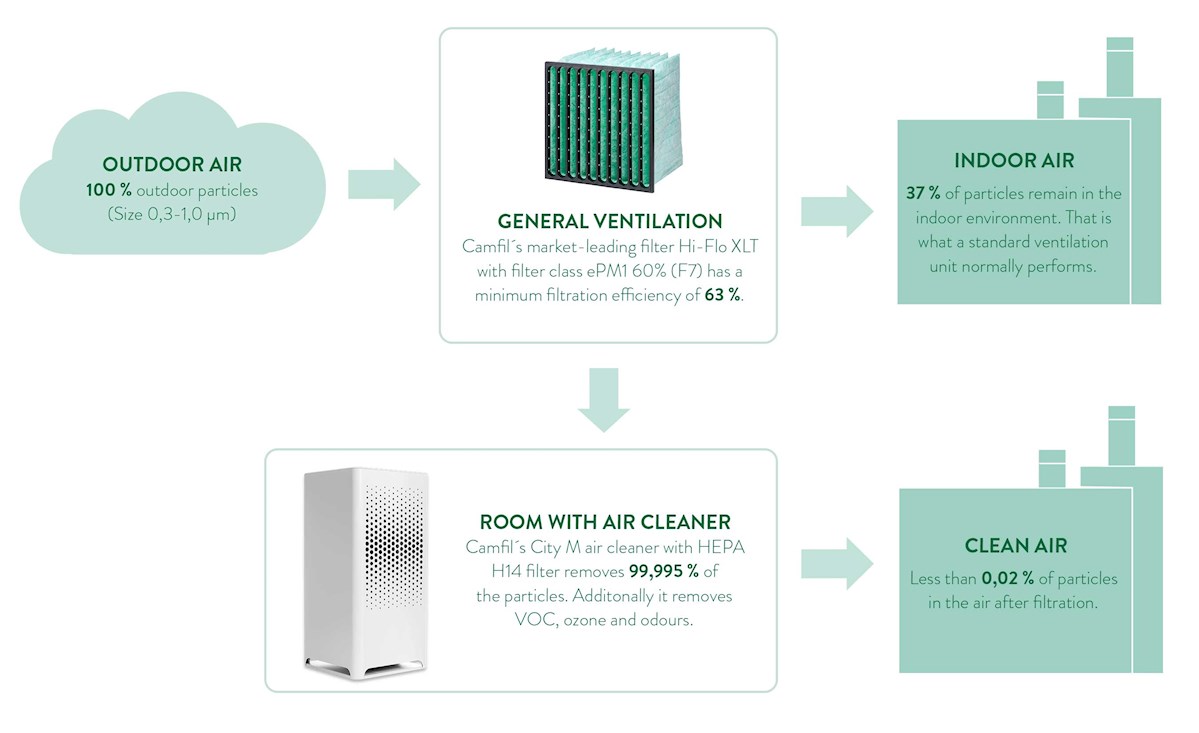 There is a parallel relationship between outdoor and indoor air as the more polluted the air is outdoors, the worse is the indoor environment. In the best-case scenario, your home or business must have a proper ventilation system with correct air filters to fight the bad indoor air quality and keep the harmful pathogens at bay. Air filtration solutions ensure good indoor air quality that adds new fresh, clean and purified air. In Nordic countries, the most common filter class for the supply air filters is ePM1 60% (revised from the old F7). This filter class successfully removes over half of the most harmful and dangerous particles known as PM1 (Particulate Matter 1). It is often possible to upgrade to higher-class filters, which can significantly reduce particle levels. In general, the standards for indoor air quality have been raised in the past few years and many of our customers are aware and demand a higher filter class. Also, the international ISO standard 16890 is a great tool for choosing the right filter class.