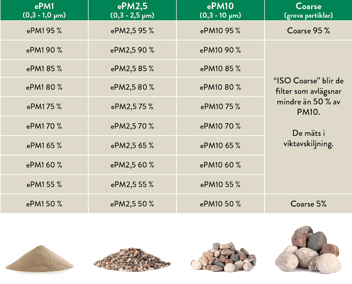 För att ett filter ska klassificera sig i någon av de tre PM-klasserna krävs en avskiljningsgrad på minst 50 % av partikelfraktionen. Om ett filter inte klarar 50 % avskiljning i någon av PM-fraktionerna, får filtret en filterklass i gruppen Coarse (grovfilter). Filtreringsgraden är ett genomsnitt med och utan statisk laddning. Filtret tilldelas även en procentsats kopplat till den PM-grupp som filtret klarar av att klassificera sig inom. Procentsatsen avrundas neråt till jämna 5 %. Här nedan visas de olika filterklasserna som ett filter kan tilldelas (30 olika klasser samt Coarse).