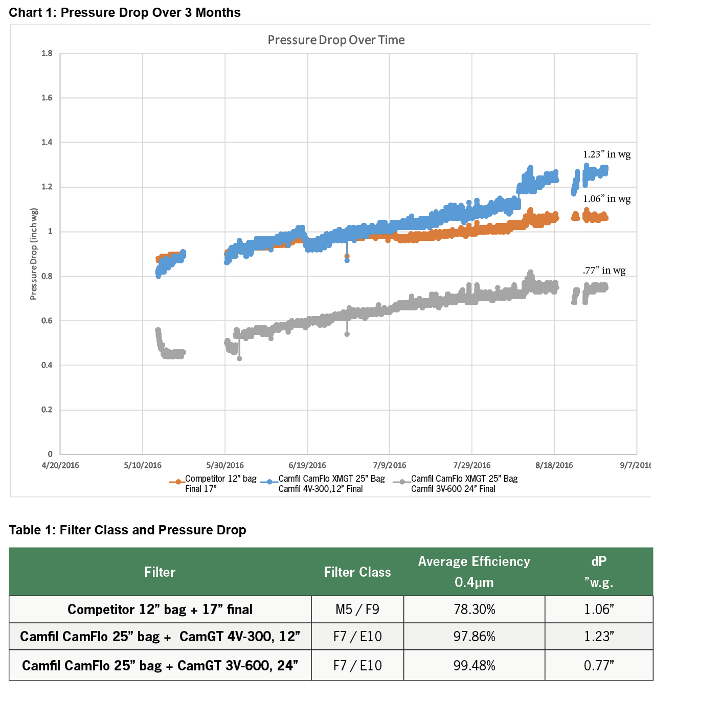 The table shows that the CamGT 3V-600 24" E103 filter, while offering a better efficiency, clearly outperformed the competitor's 17", F9 filter in terms of pressure drop. The Camfil CamGT 4V-300 12" E10 filter had a similar pressure drop performance to the competitor initially, even with it's higher efficiency. This highlights that filter depth is only one part of the design - aerodynamics, media performance, media surface, as well as construction, are equally important in designing a well-performing filter.