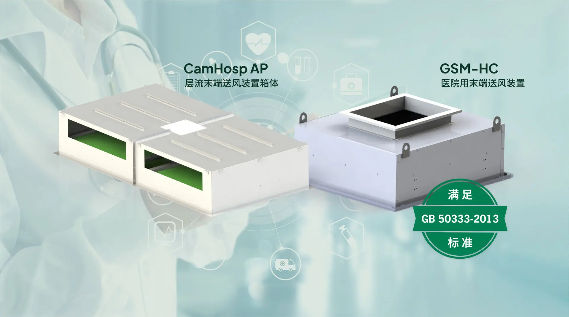 康斐尔全新CamHosp AP 医院用层流末端送风装置及GSM-HC 医院用末端送风装置,适用于医院手术室、洁净病房等需要高洁净度环境的场所,赋能国内医疗环境品质升级。