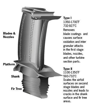 摄入的污染物可导致燃气涡轮发动机的压缩机、燃烧器和涡轮部分出现腐蚀。热腐蚀是涡轮部分中最严重的腐蚀形式。这是一种加速氧化形式,由组件和沉积在其表面的熔盐产生。硫酸钠(Na2SO4)通常是引发热腐蚀的主要沉积物,并且会随着燃气轮机部分温度水平的增加而变得更加严重。