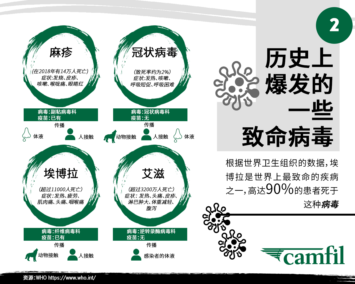保持良好的卫生习惯和戴口罩是保护自己的好方法,但这就足够了吗? 有些病毒可以接种疫苗,有些则不行。那些没有有效疫苗的病毒很难控制,加上高感染率和高死亡率,这会变得非常严重,很难控制其广泛传播。世界卫生组织(WTO)在历史上曾多次宣布由于致命病毒感染而引起的警报和疫情,以下是一些值得注意的地方:2003年2月,严重急性呼吸系统综合症(SARS 非典)导致约10%的患者死亡。40年来,埃博拉病毒病死率从25%到90%不等。新型冠状病毒开始于2019年,已经有超过70000例报告确诊病例,而且这个数字还在增长。