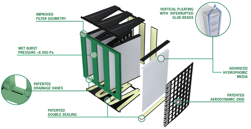 Advanced hydrophobic media and our patent pending double sealed construction eliminates water bypass and dissolved salts from entering your gas turbine. Fouling and corrosion are therefore no longer a risk, eliminating the risk of unplanned downtime for engine maintenance.
