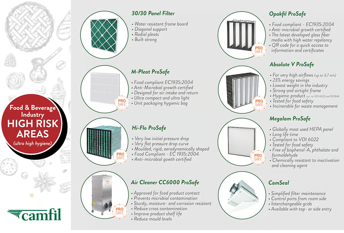 第一步是确定与空气质量挑战相关的食品加工企业的风险领域。对于低风险区域,食品不太可能含有致病微生物,并且由于食品特征(例如,质地、尺寸、外观、颜色或性质)不支持致病微生物的生长,因此空气质量建议已作为标准建议。水果、蔬菜、谷物、谷类等干燥食物遭受污染的风险较低。因此,所需的最小过滤程度各不相同。在某些情况下,客户安装ePM 1过滤器或ISO初效过滤器,并可选择升级为ProSafe,以降低风险并保护设备。