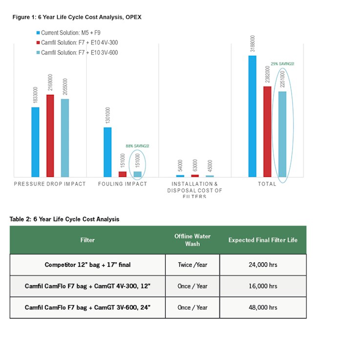 圖1表明,對於六年內的總體擁有成本TCO預計來說,配置3V-600末級過濾器的方案TCO最低。該方案擁有更高的E10效率等級的末級過濾段,結垢影響將降至最低。因此,高達88%的成本節約是減少結垢後,功率輸出升高的結果。表2顯示,該工廠可通過減少一半的離線清洗次數來減少維護需求,從而最大程度地降低這種結垢影響。