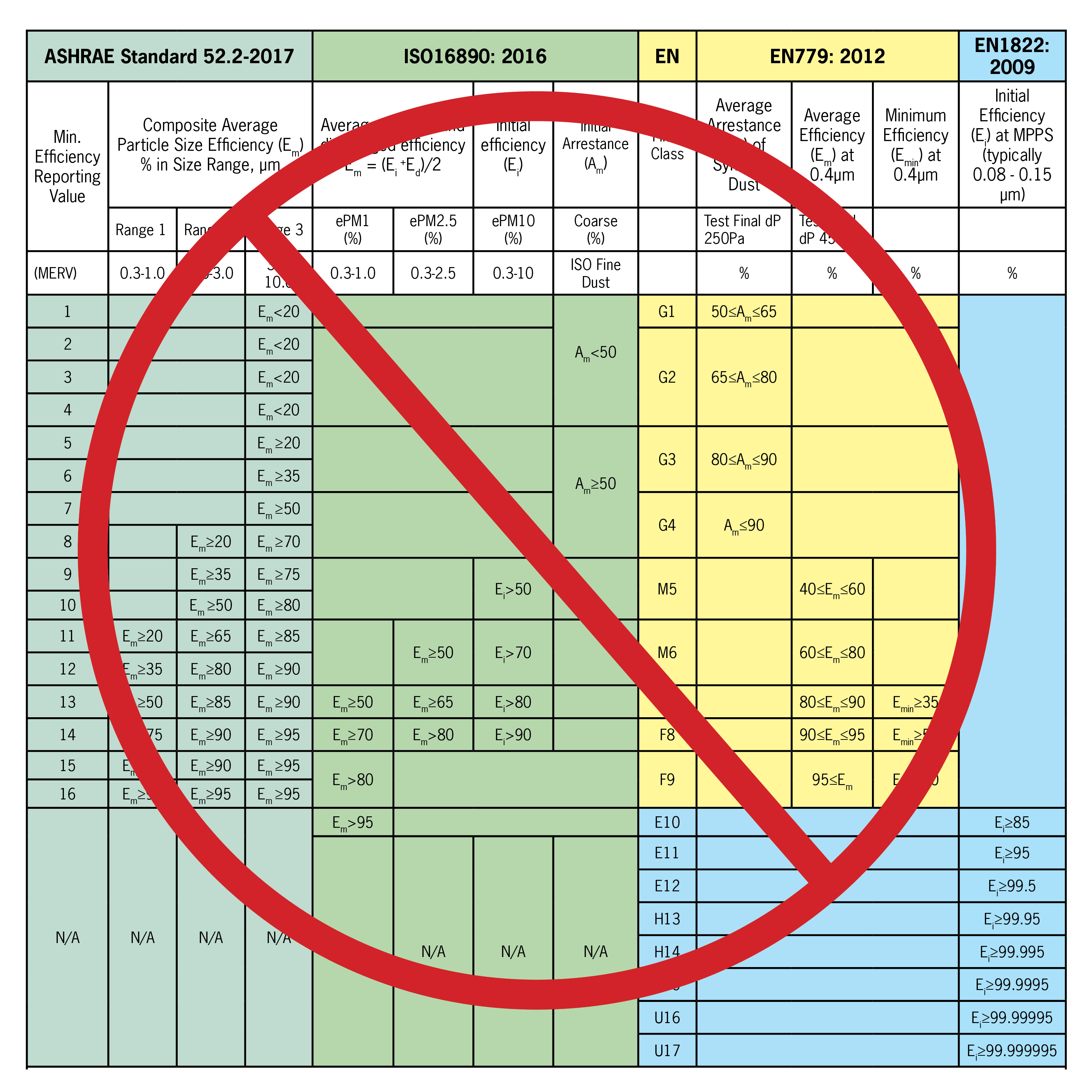 表中顯示的ISO 29461-1:2021分级體系使用ISO 16890和ISO 29463的测试方法對過濾器劃分组别和等级: